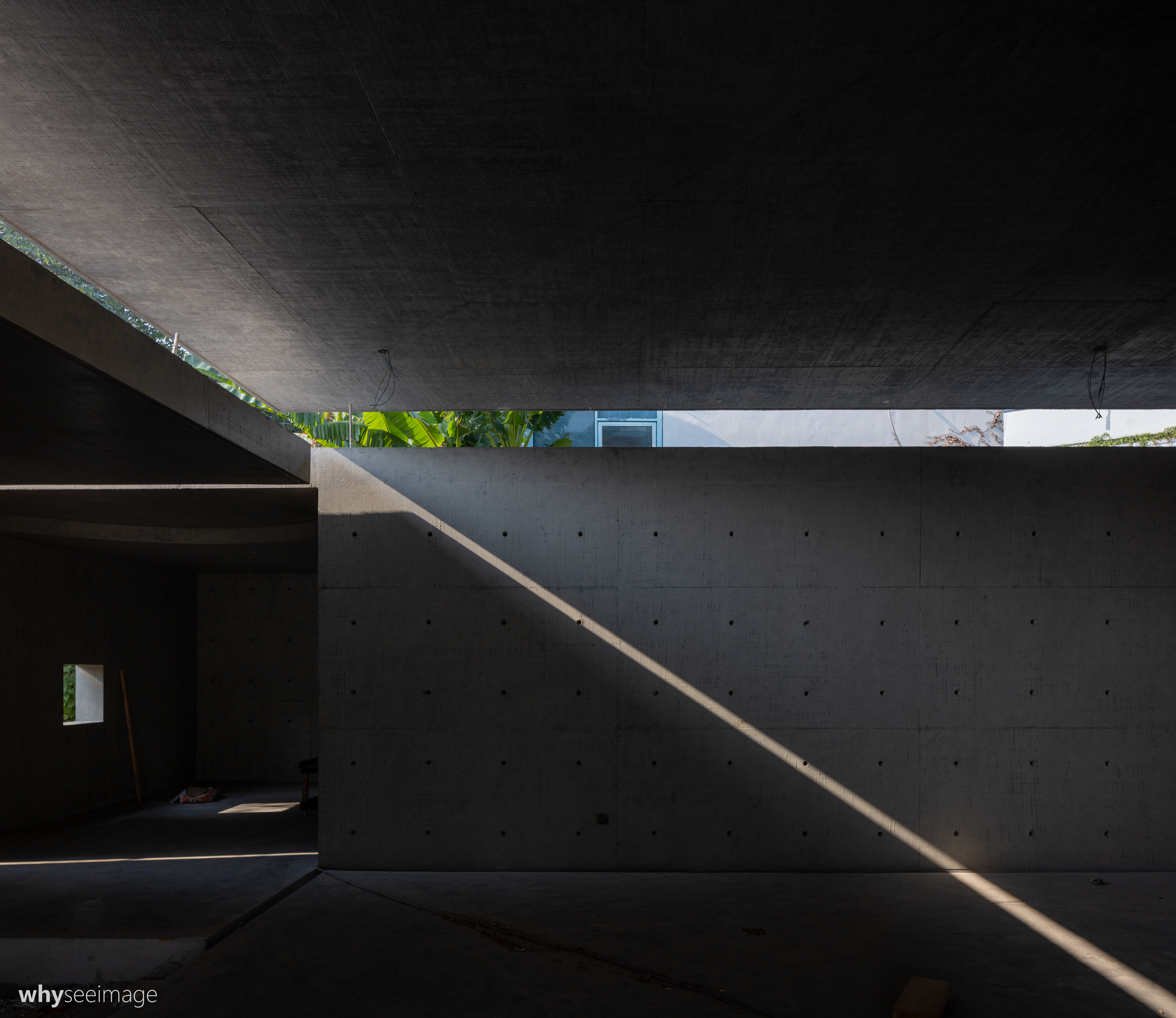 在后湖麦垛空间旁边,土建施工看着弄完好一阵了,上大下小的收分形体,梁板柱收拾得很清爽,南侧的人行入口廊道侧面开长条形洞口,砌有一溜美人靠,进入到室内的明暗体验蛮有趣的。