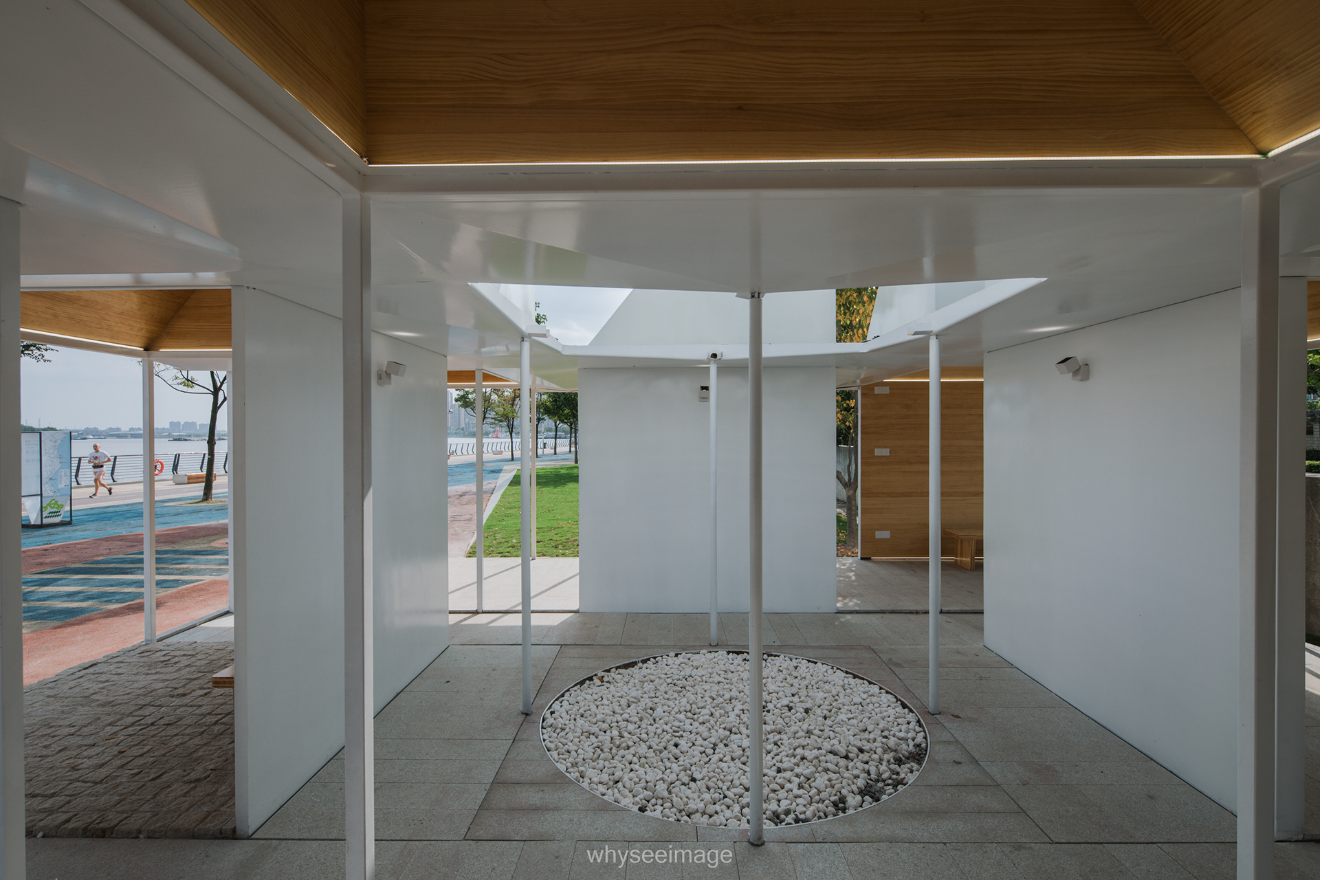 Hetu Luoshu Pavilion is a lightweight steel structure multi-functional pavilion on the Xuhui West Bund in the 2023 Shanghai Urban Space Art Season. The nine-square spatial layout and single-slope skylights in different orientations bring a rich visual experience. On the north side is an open basketball court. People who are tired from walking along the riverside trail will also be curious to come over and take a look at this transparent little house. Only after reading the article about Atelier GOM did I understand the subtle ground height difference. However, the current outdoor experience is also very enjoyable. Sitting inside with the not-so-unwanted river breeze is really comfortable.