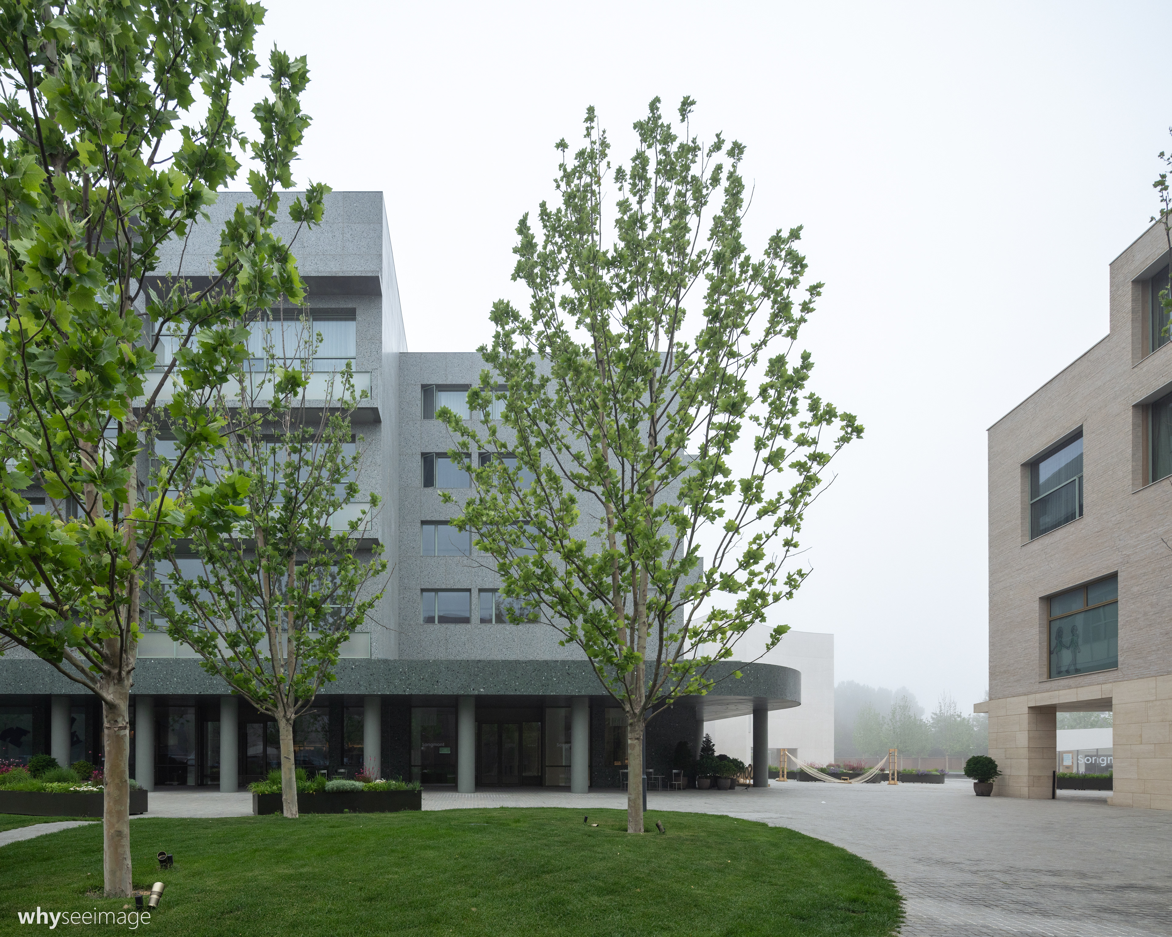 These are group of hotels and apartments in the Youyi Bay of Aranya North Shore Community, with a colonnade space on the first floor enriching the walking experience of the enclosed square.